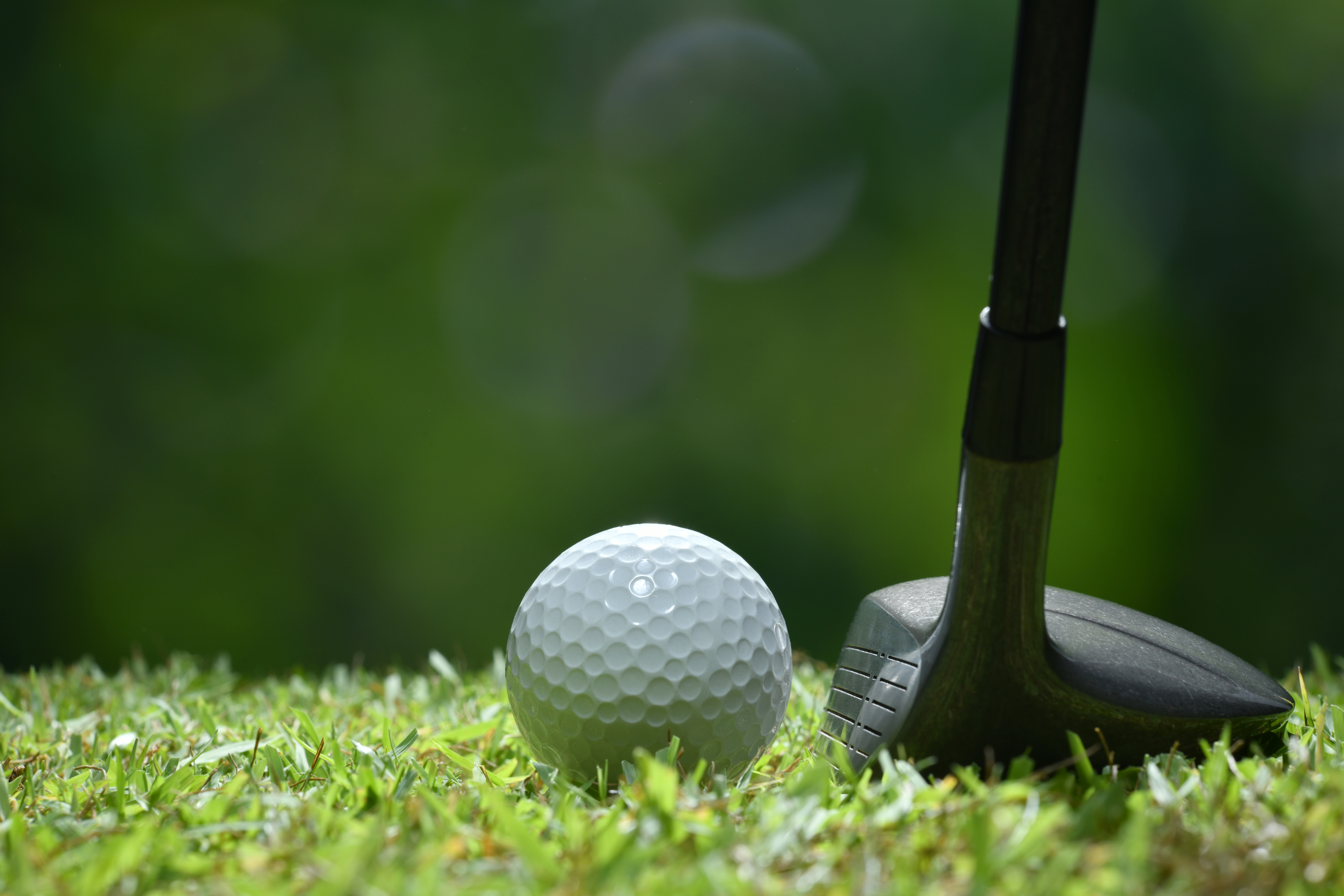 Golf ball on green grass ready to be struck on golf course background